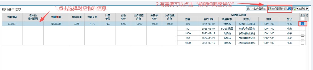 注:如果有需要调整库存位置:先点击对应物料信息,然后点击右边的“按明细调整货位”并在右边勾上对应物料。