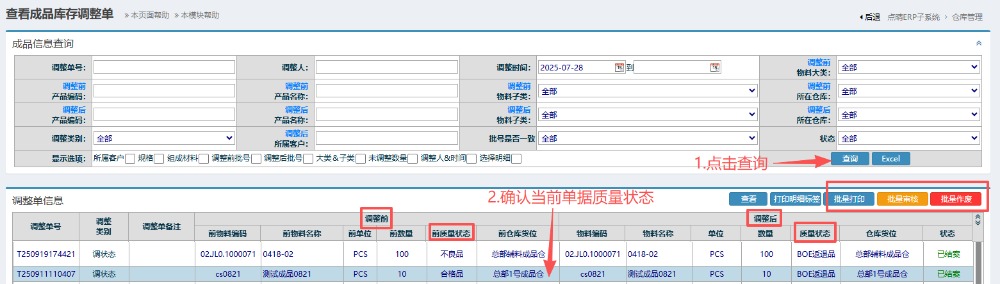 5.进入界面后,按图操作:先点击查询,确认当前调整单的质量状态