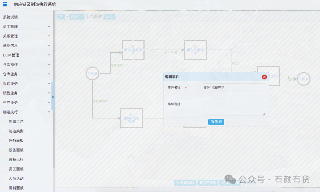 基于AOE网,建立的作业流程,即MES制造的核心基础数据。在这个流程数据上,几乎可以做任何文档、图纸、质检、安灯、自动化等等的扩展。