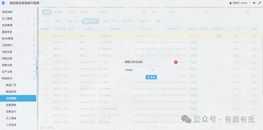 当任务指派后,即会派生一个任务给指派的人员,管理员可以在任务面板查看所有的任务,并可以通过制造实例、人员等进行筛选,员工也可以在我的任务,查看指派给我的任务。