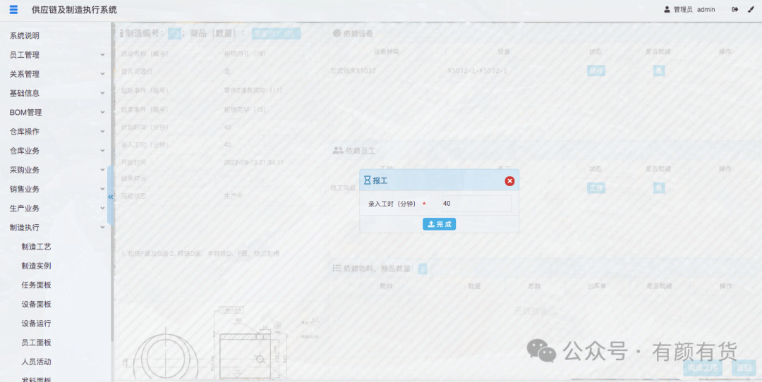 当任务完成后,员工点击完成任务按钮,弹出报工界面,填写录入工时:
