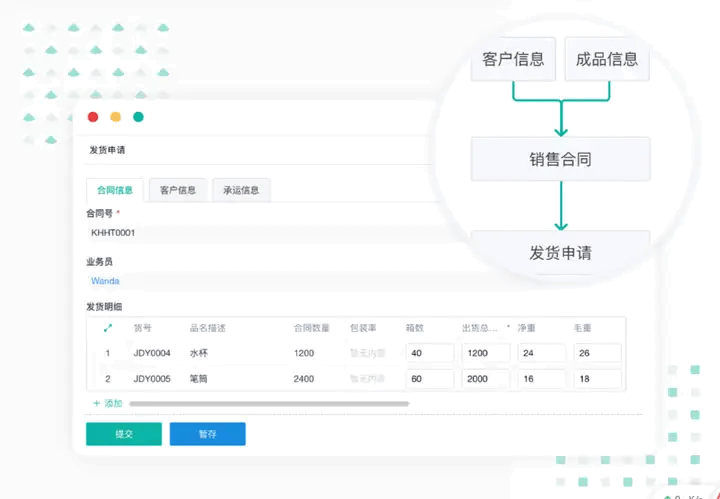 打破销售、生产部信息壁垒,避免逾期发货。销售根据实际客户、成品信息签订合同,在线发起发货申请,生产部门实时获取发货消息,有效保障交易顺利执行。