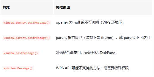 在 WPS 插件或类似环境中,跨窗口通信应优先使用: