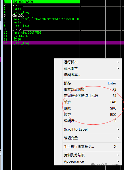 脚本编写后,我们启动调试器,拖入EXE加密视频后,在反编写窗口中右键找到脚本插件 脚本流程就是对机器码位置下断点,一直监控当前地址和断点地址判断,然后修改EDX的值。自动执行脚本。 根据命令,我们可以单步执行命令,看看有没错的地方。有错误它会报,然后我们修改即可。 如果脚本无误,按空格键它就会自动执行脚本去修改机器码了。这样每次启动脚本自动执行就固定了机器码,是不是非常方便。