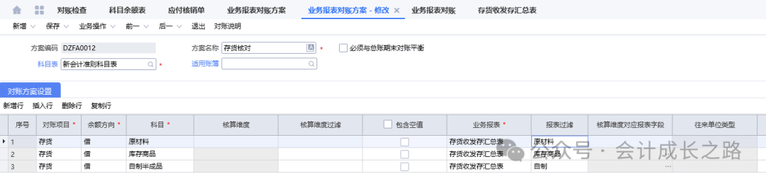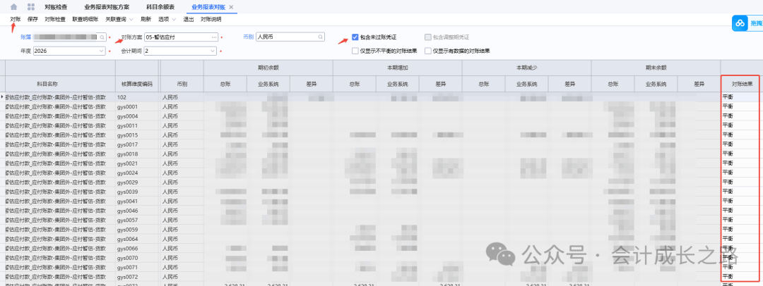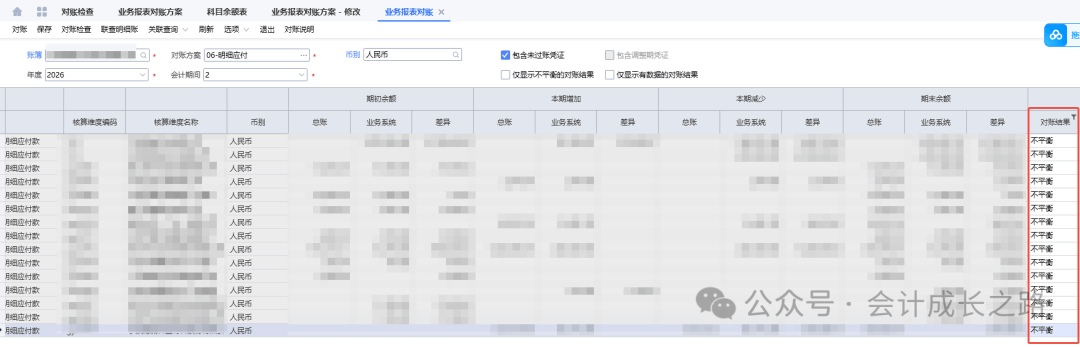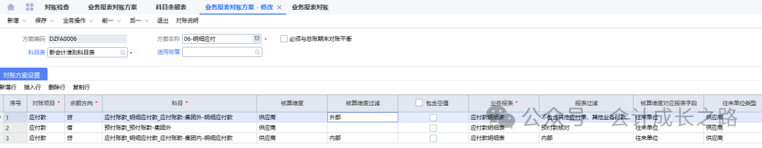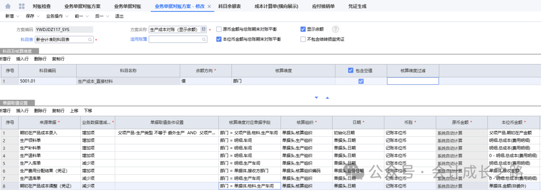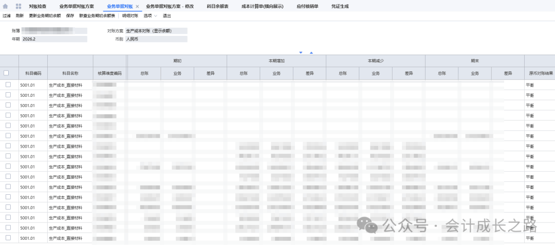 今天讲讲金蝶云星空结账流程中第20步对账工作,有2种方法:将科目余额表和对应单据明细导出来手工核对;还有一种是利用系统的对账功能。下面我们详细讲讲系统对账功能的使用。之前都是手工核对,这个功能今天刚学习才开始启用,第一次设置会经常出现对账结果不平衡,需要反复修改对账方案。建议先手工核对一遍,有了对账结果,再使用设置的对账方案对账,这样差异在哪里,怎么调整对账方案就有思路了。1、暂估应付对账(科目余额表应付暂估余额与应付未开票明细表余额核对)金蝶入口:财务会计-智能会计平台-业务报表对账方案;财务会计-智能会计平台-业务报表对账-选择对账方案-勾选包含未过账凭证-对账-对账结果-不平衡的去查原因解决。一般差异由手工凭证造成差异,正常情况走模块对账基本平衡。- 比如成本调整单调整:在供应商发票未入账之前,发现采购合同单价远高于往期结算价导致暂估应付单中存货金额偏高,而采购又不退货重下订单,此时为了存货金额不受影响,做了成本调整单(借:应付账款暂估,贷:原材料)。