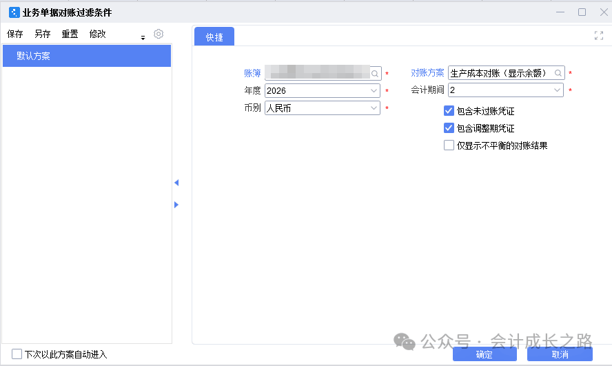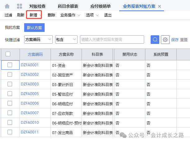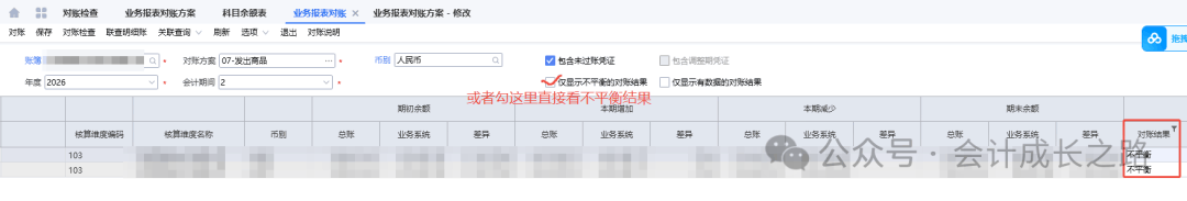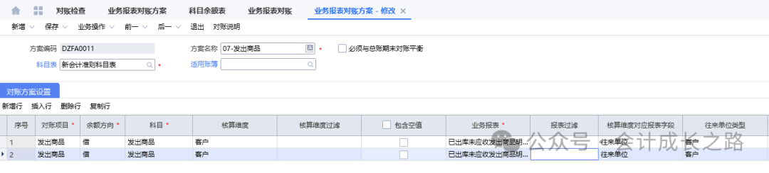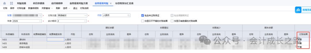 2、明细应付账款对账(科目余额表明细应付款余额和预付账款余额与应付款明细余额核对)选择明细应付对账方案。一般差异造成原因是漏生凭证。3、发出商品对账(科目余额表发出商品余额与已出库未应收明细表核对)4、生产成本/直接材料对账(科目余额表生产成本余额与成本计算单期末在产品金额核对)金蝶入口:财务会计-智能会计平台-业务单据对账方案;财务会计-智能会计平台-业务单据对账-选择对账方案-勾选包含未过账凭证/包含调整凭证-确定-更新业务期初余额-执行-刷新5、委托加工物资对账(科目余额表委托加工物资余额与成本计算单成本中心空白行对应期末在产品余额核对)由于我司委外加工采用倒冲领料方式,期末委托加工物资金额为0,在此就不做演示了。6、存货对账(科目余额表原材料/库存商品/委外半成品/自制半成品余额与存货收发存汇总表期末余额核对)金蝶入口:财务会计-智能会计平台-业务报表对账方案-新增-根据对账逻辑设置;进入业务报表对账-选择对账方案-勾选包含未过账凭证-对账-对账结果-不平衡的手工再核对一遍看具体差异在哪里,再处理。