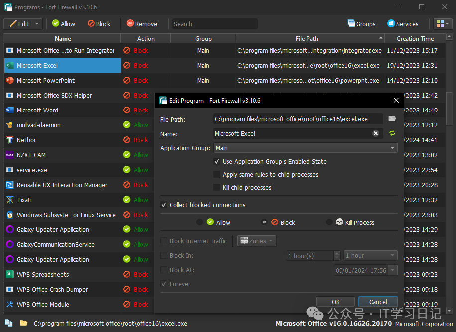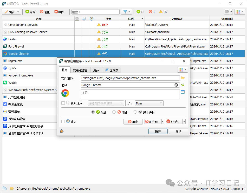 - Windows系统的传统防火墙规则管理繁琐,配置多了后很难区分。Fort工具支持应用程序分组(Grouping),用户可以按浏览器、办公软件等分类自定义管理,甚至可以使用通配符(/**)批量拦截子目录程序