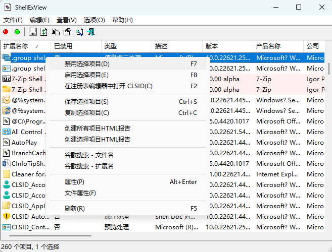 它可以精准识别每个外壳扩展的 CLSID 标识符、安装路径等详细信息。尤其能标出粉红色显示的第三方程序(含流氓软件)安装的扩展,让你快速定位并彻底删除:先在注册表打开并删除对应 CLSID 子键,再删除 DLL 文件,一步到位干净清理。