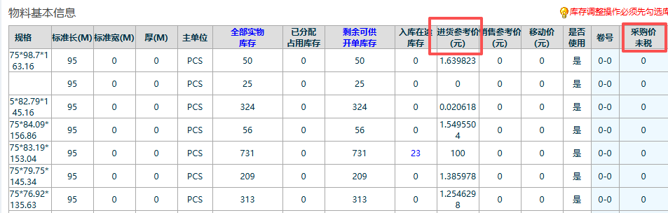 先在系统进入"报表查询" 》“物料库存查询”页面,库存表里的采购价需要重算库存 。 如果有些物料重算后还是没有说明就是非采购入库进来的材料。