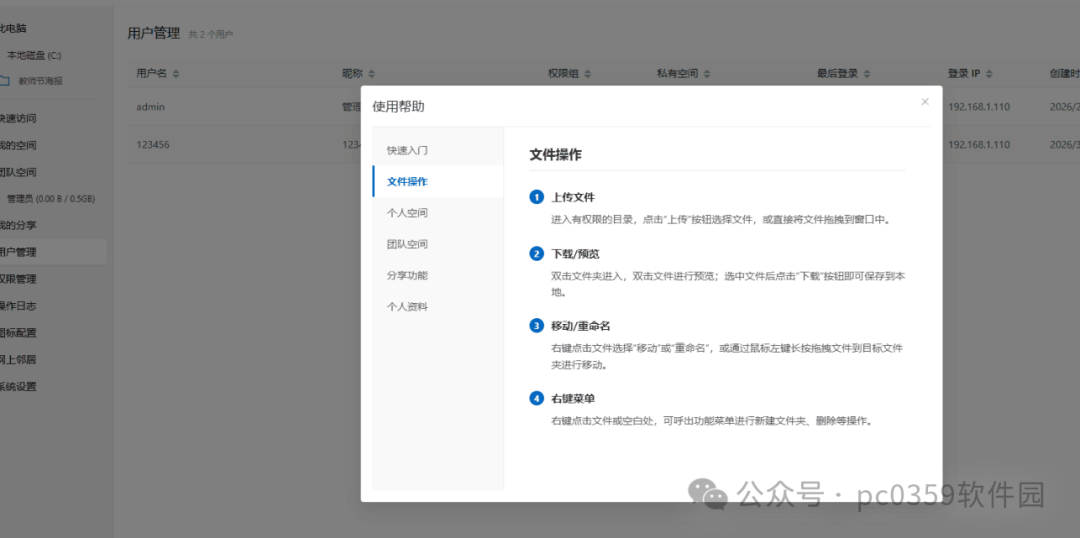 3.增加在线教程,增加用户管理快速打开私有文件夹;其他优化功能;