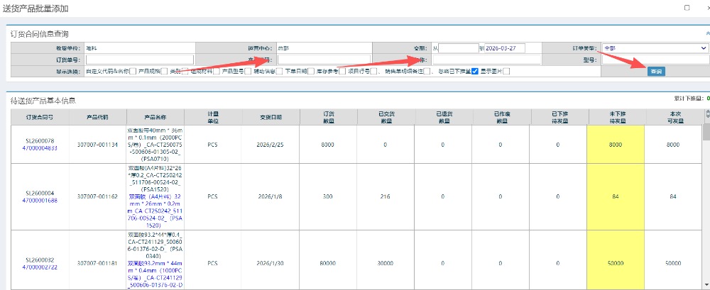 提交即可查询到对应的送货单;菜单为仓库管理-物料出库管理-销售出库管理-送货单明细管理:如下图所示: