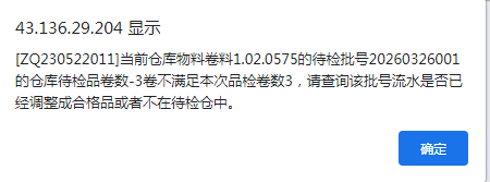 【点晴模切ERP】提示:当前仓库物料卷料的待检批号的仓库待检品卷数-3卷不满足本次品检卷数3,请查询该批号流水是否已经调整成合格品或者不在待检仓中,如何解决?