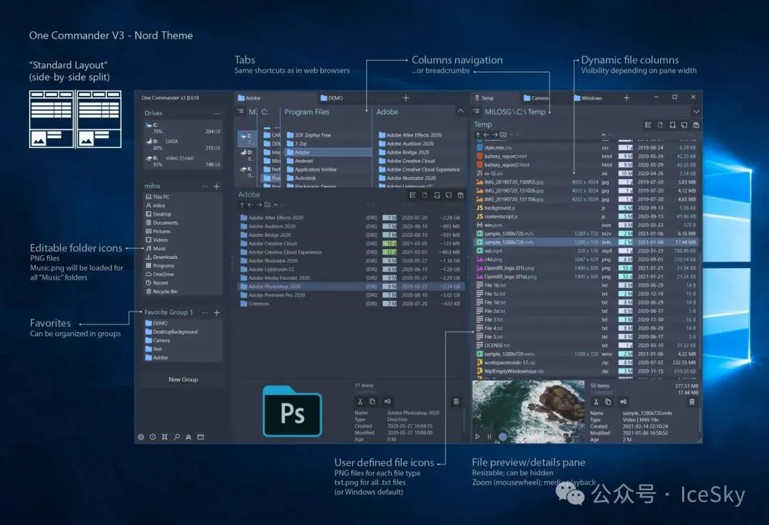 OneCommander是一款功能强大且灵活的双窗格文件资源管理器,适用于Windows11/10操作系统。具有现代化的UI界面,使用文件夹列的形式,使得在复杂的文件夹树结构中导航变得快速和直观。工具免费供家庭使用,没有广告,专业/商业用途需要Pro许可证。核心特点:多标签页管理:使用多个选项卡,同时处理不同的位置或任...