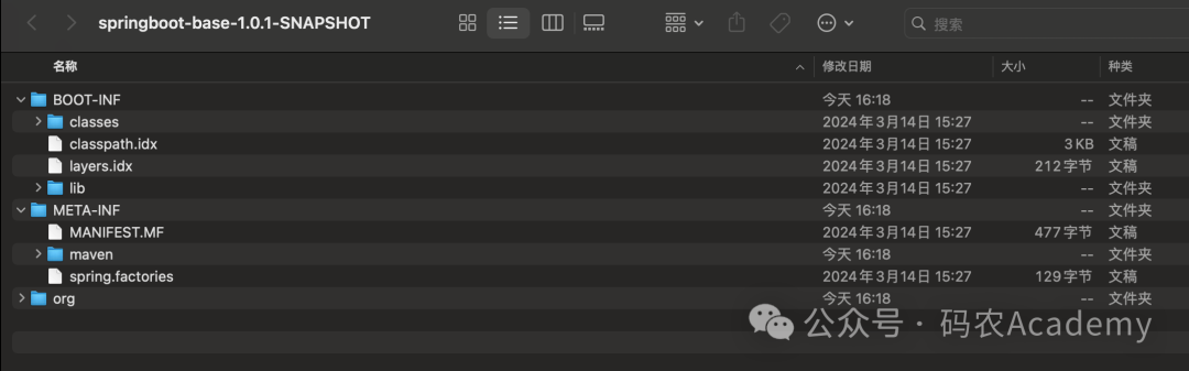 Spring Boot应用打包机制均确保了生成的包不仅包含了项目本身的类,还包含了运行时所必需的所有依赖库,以及一些特定的元数据(如MANIFEST.MF中的启动类信息)。这一特性大大简化了部署过程,并有助于提升应用的可移植性和维护性。Fat jar中的内容: