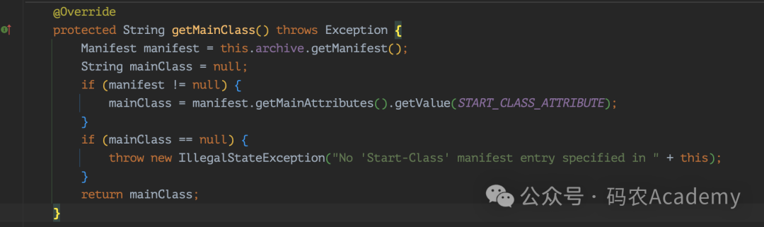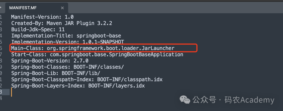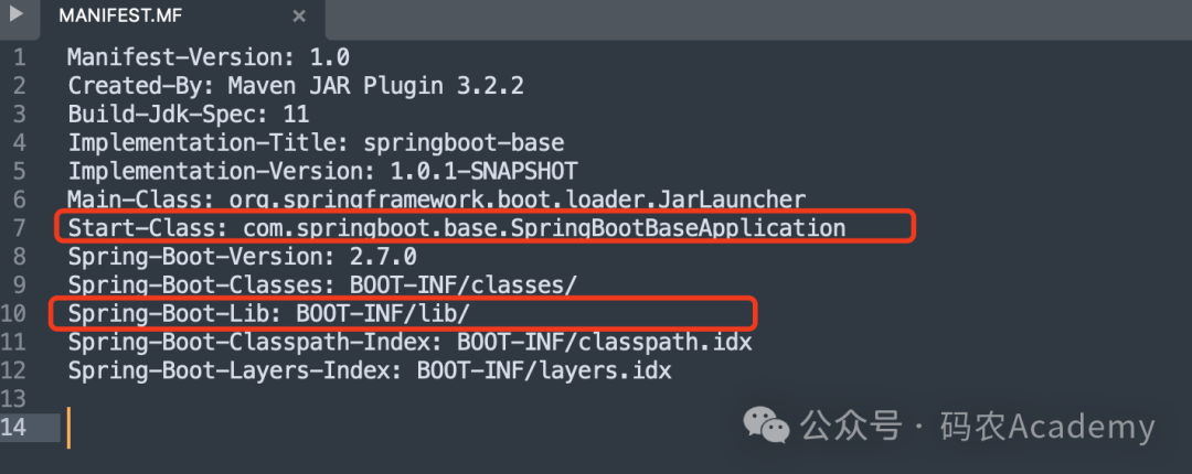 Spring Boot的启动器类加载器LaunchedURLClassLoader首先会读取MANIFEST.MF中的附加属性,如Start-Class(标识应用的实际主类)和Spring-Boot-Lib(指向内部依赖库的位置)。