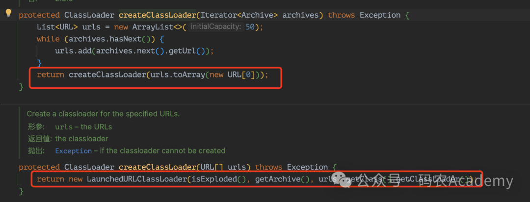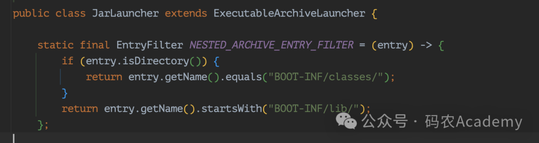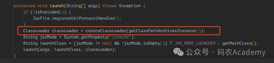 Main-Class属性指向的JarLauncher类是Spring Boot自定义的类加载器体系的一部分。JarLauncher继承自org.springframework.boot.loader.Launcher,专门用于启动以Fat JAR形式发布的Spring Boot应用。JarLauncher负责创建一个类加载器LaunchedURLClassLoader。