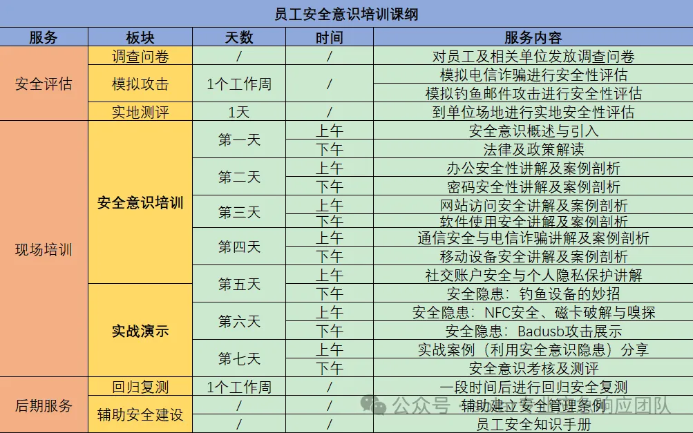 ID,关闭了系统的部分服务与进程,随机生成AES密钥用于加密文件,并用随机生成的公钥加密AES加密的相关信息写在文件头部。资产梳理排查目标:根据实际情况,对内外网资产进行分时期排查 服务方式:调研访谈、现场勘查、工具扫描 服务关键内容:流量威胁监测系统排查、互联网暴露面扫描服务、技术加固服务、集权系统排查 目标 主要目标设备 目标: 形式: 线下培训课表 1.提供相关的安全意识培训材料,由上而下分发学习 2.组织相关人员线上开会学习。线上培训模式。 线上学习平台6.安全建议