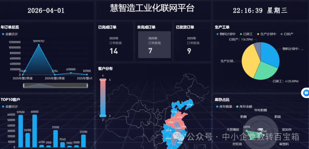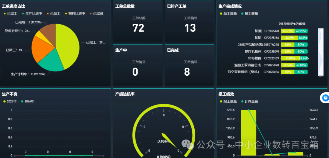 上面实时显示:今日生产进度、订单完成率、库存状态、人员报工情况……