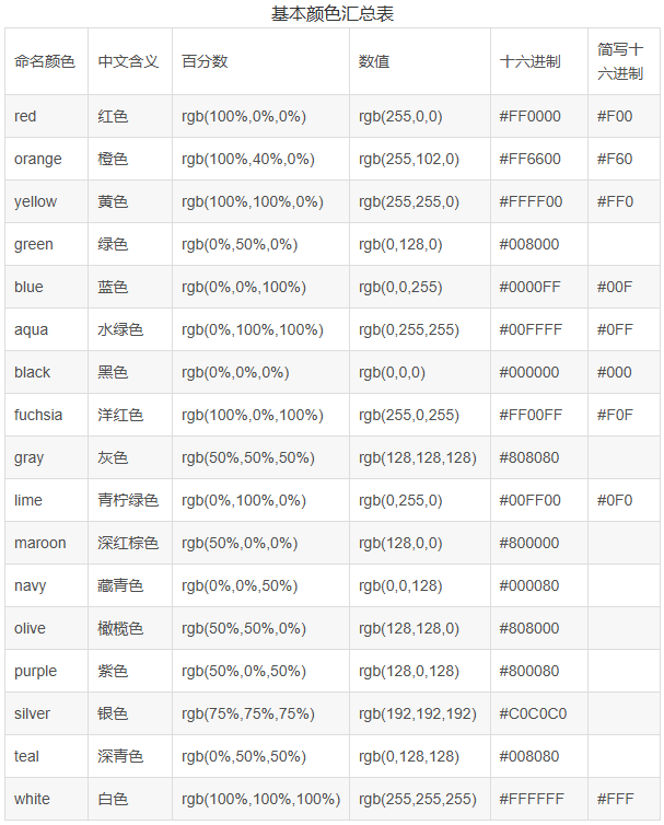 总体结构是先介绍了CSS中用命名颜色表示颜色的方法,再介绍了用RGB指示颜色的方法,其中函数式表示有两种(一为百分数记法,二为整数三元组记法),十六进制记法有两种(一为全写,二为简写),最后用表格的形式汇总了17种基本命名颜色的相关信息。