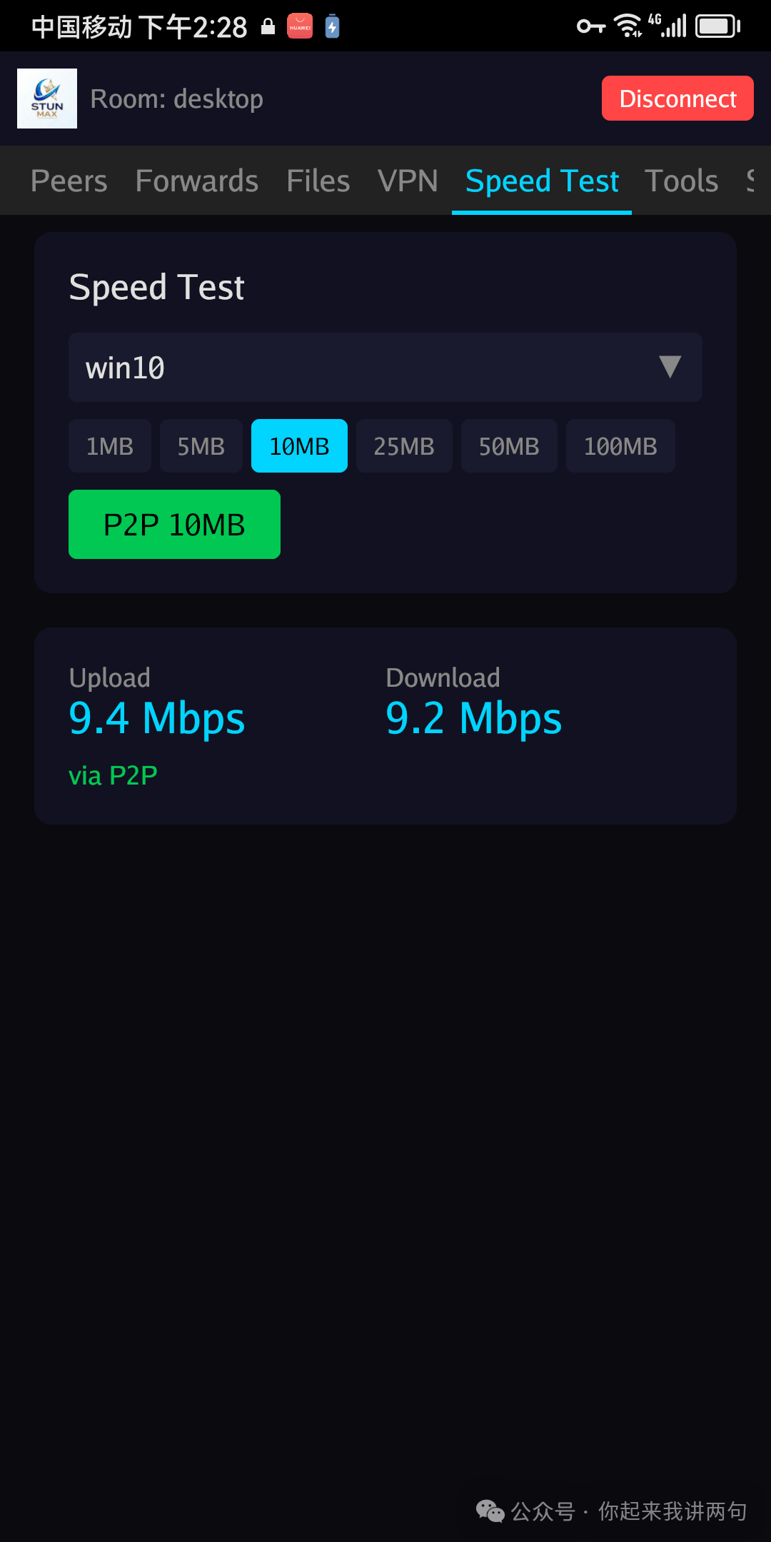 家里的群晖 NAS 在 NAT 后面,没有公网 IP。之前用 frp 转发,但需要一台公网服务器且带宽受限。现在用 STUN Max,两台设备加入同一个房间,P2P 直连,下载速度直接拉满家里的上行带宽。