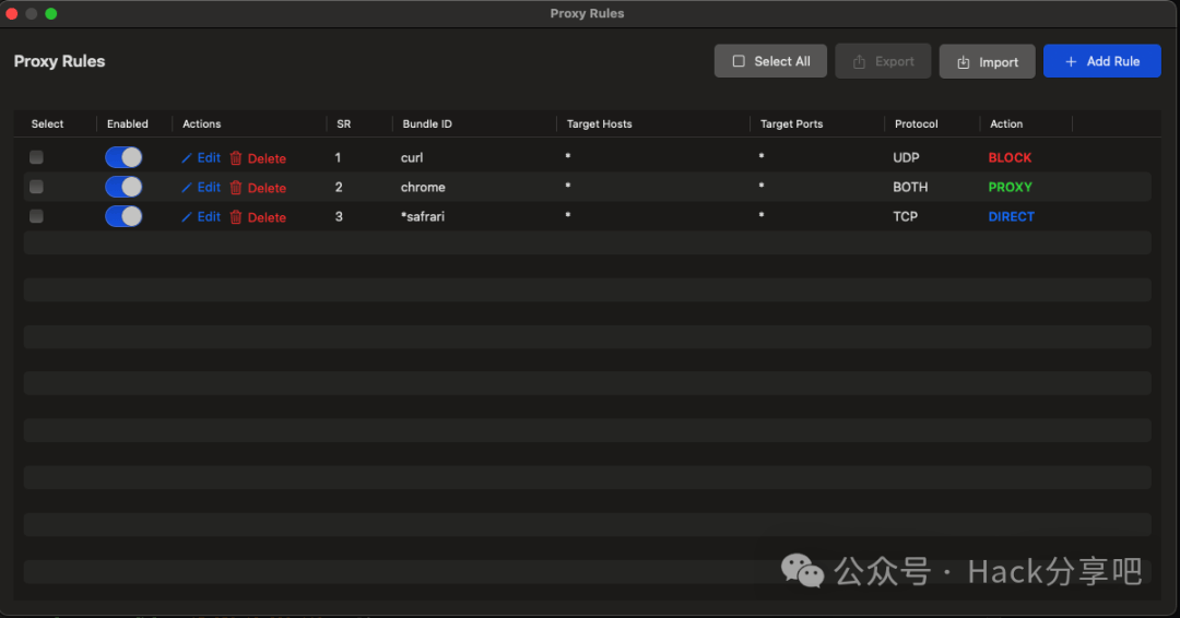 跨平台——支持 Windows、macOS 和 Linux双接口——功能丰富的图形界面和强大的CLI适用于所有用例基于进程的流量控制——为特定应用路由、阻断或允许流量通用兼容性——适用于代理不知情的应用程序多代理协议——支持 SOCKS5 和 HTTP 代理系统级拦截——内核/网络扩展层面的可靠数据包捕获无需配置——应用程序无需修改即可运行协议无关——兼容TCP和UDP协议(HTTP/HTTPS、HTTP/3、数据库、RDP、SSH、游戏、DTLS、DNS等)流量拦截——阻止特定应用程序访问互联网或任何网络(局域网、本地主机等)灵活规则——直接连接、代理路由或每个进程完全阻塞高级规则配置——针对特定进程、IP、端口、协议(TCP/UDP)和支持通配符的主机名进程排除——通过排除代理应用来防止代理循环导入/导出规则——通过基于JSON的导入/导出在不同系统间共享规则配置