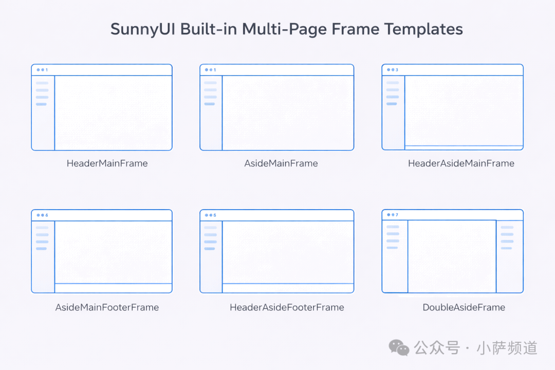这是 SunnyUI 最被低估的功能。它内置了 7 种多页面应用框架模板,参考了 Element UI 的页面组织方式,主frame + aside 导航 + 内容区,配合 UIPage 基类管理页面的初始化和销毁。