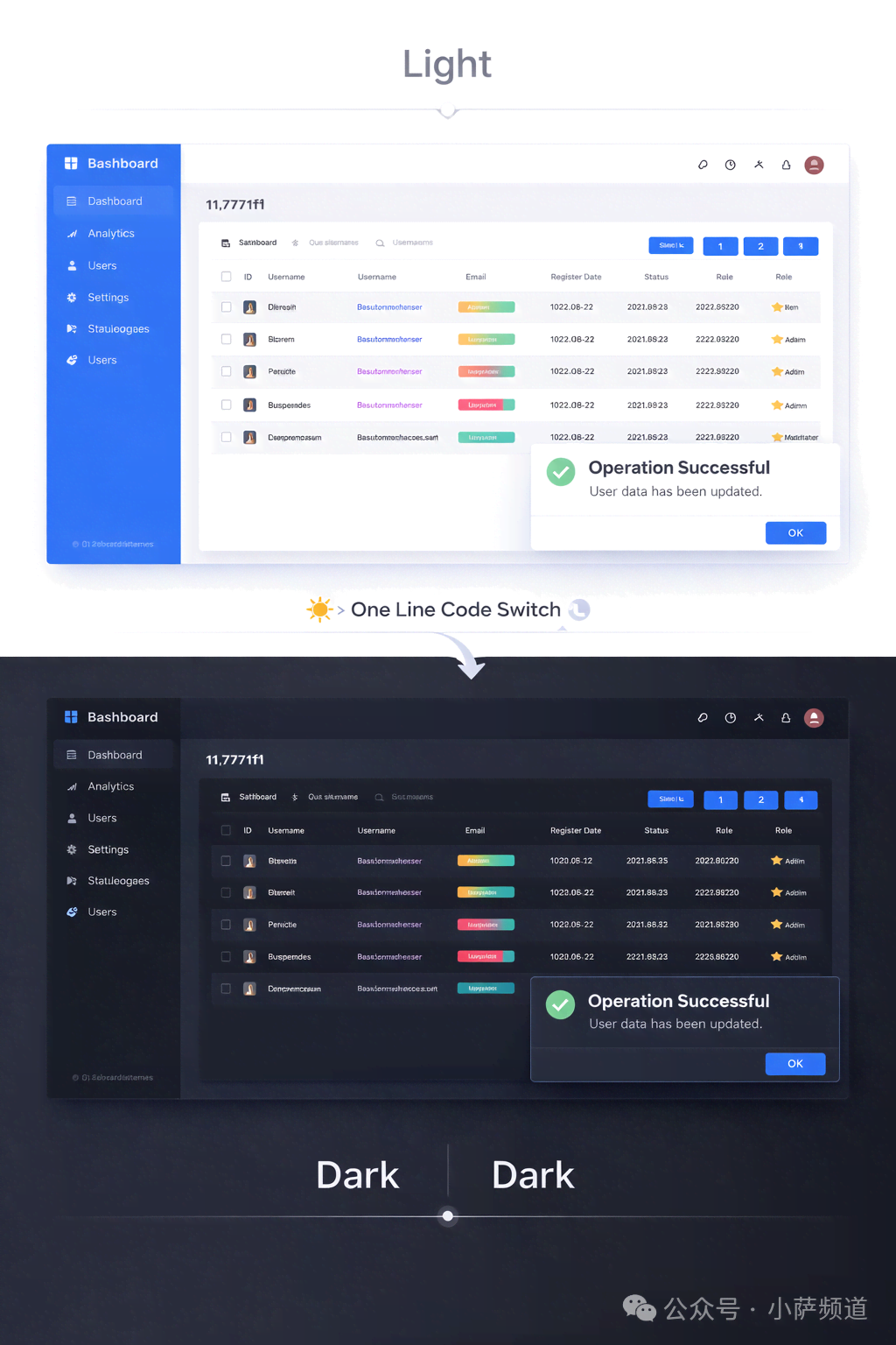 AntdUI内置了完整的亮色/暗色主题切换机制。不需要重写界面,只需要一行代码:
