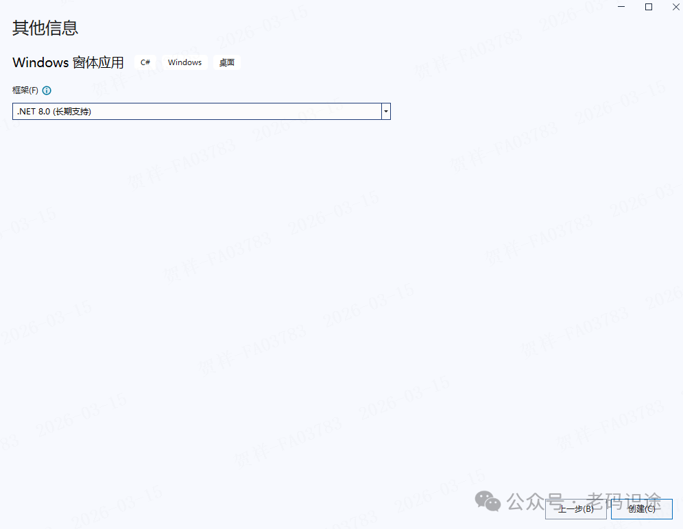 在“其他信息”对话框中,选择应用程序目标框架,在此默认选择“.NET8.0(长期支持)”,也可以通过右侧的下拉箭头进行修改,然后点击“创建”按钮