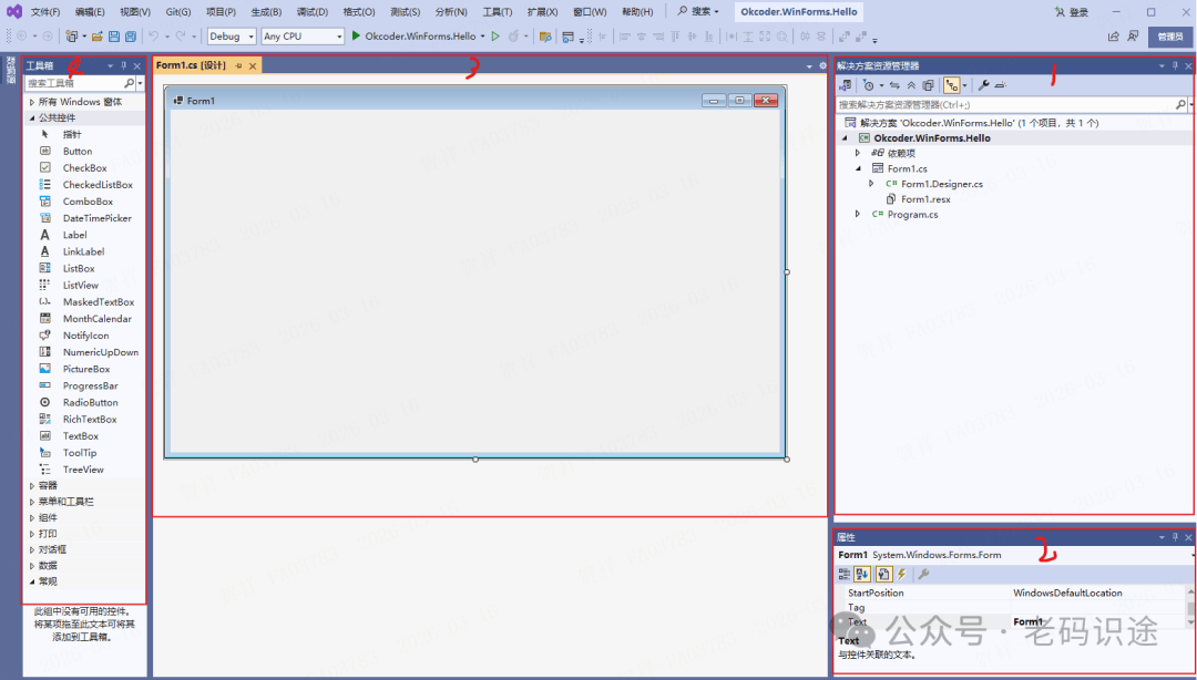 在Visual Studio设计器,选择Form窗体,在右下角的属性窗口中,可以直接设置对应的属性,如下所示: