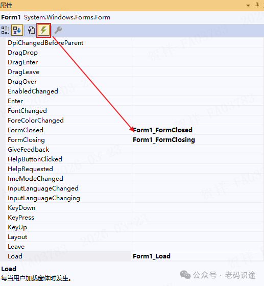 事件也可以在属性窗口切换事件Tab页后进行双击设置。如下所示: