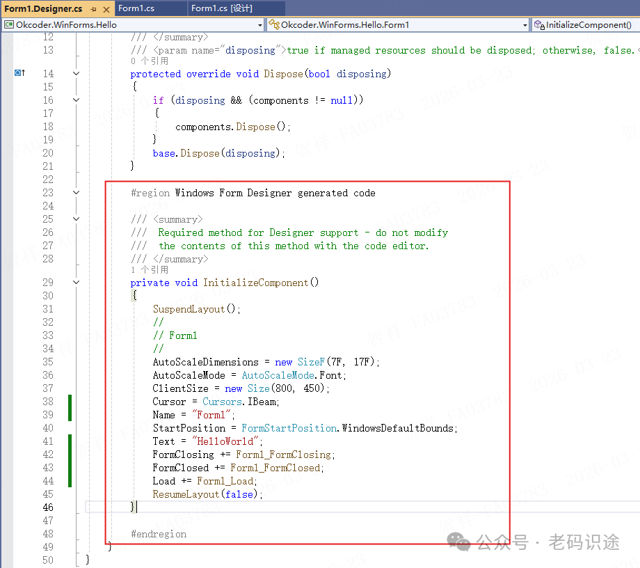 当通过属性窗口中设置相应的属性和事件后,会在窗体对应的Designer.cs类文件中自动生成相关代码,如下所示: