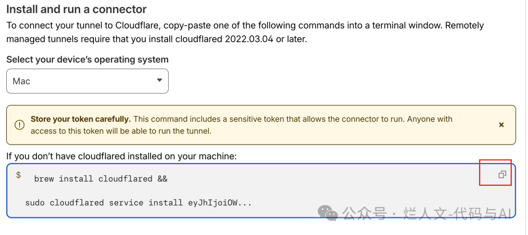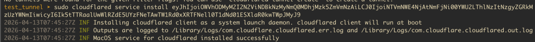 以 macOS 为例,复制页面上的命令到终端执行。跑完以后,cloudflared 会装好,并作为后台服务启动。
