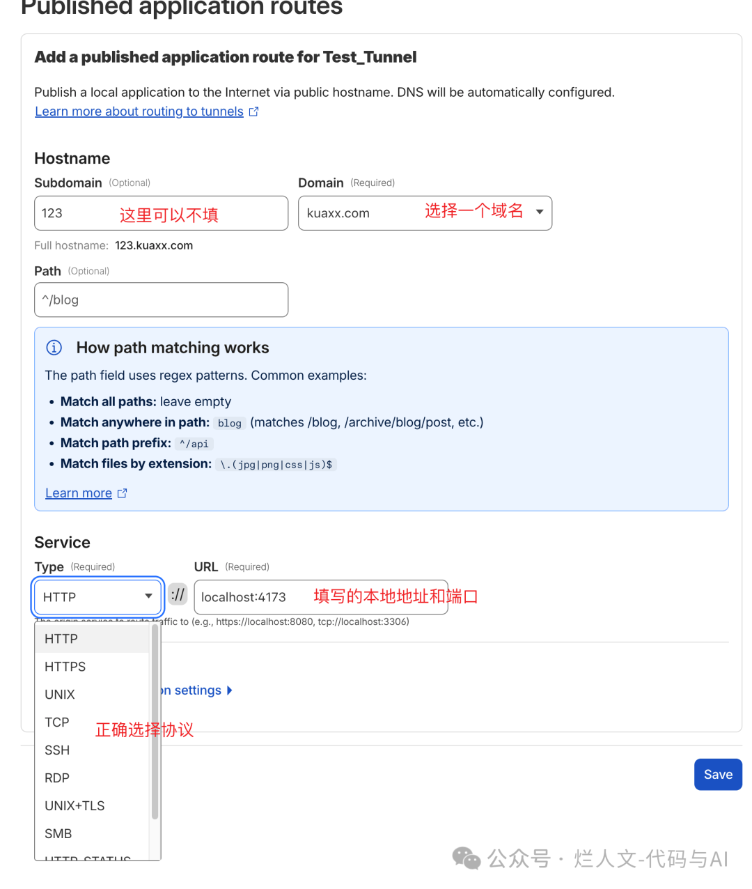 在 Public Hostname 里填二级域名、协议类型,以及本地服务的地址和端口。