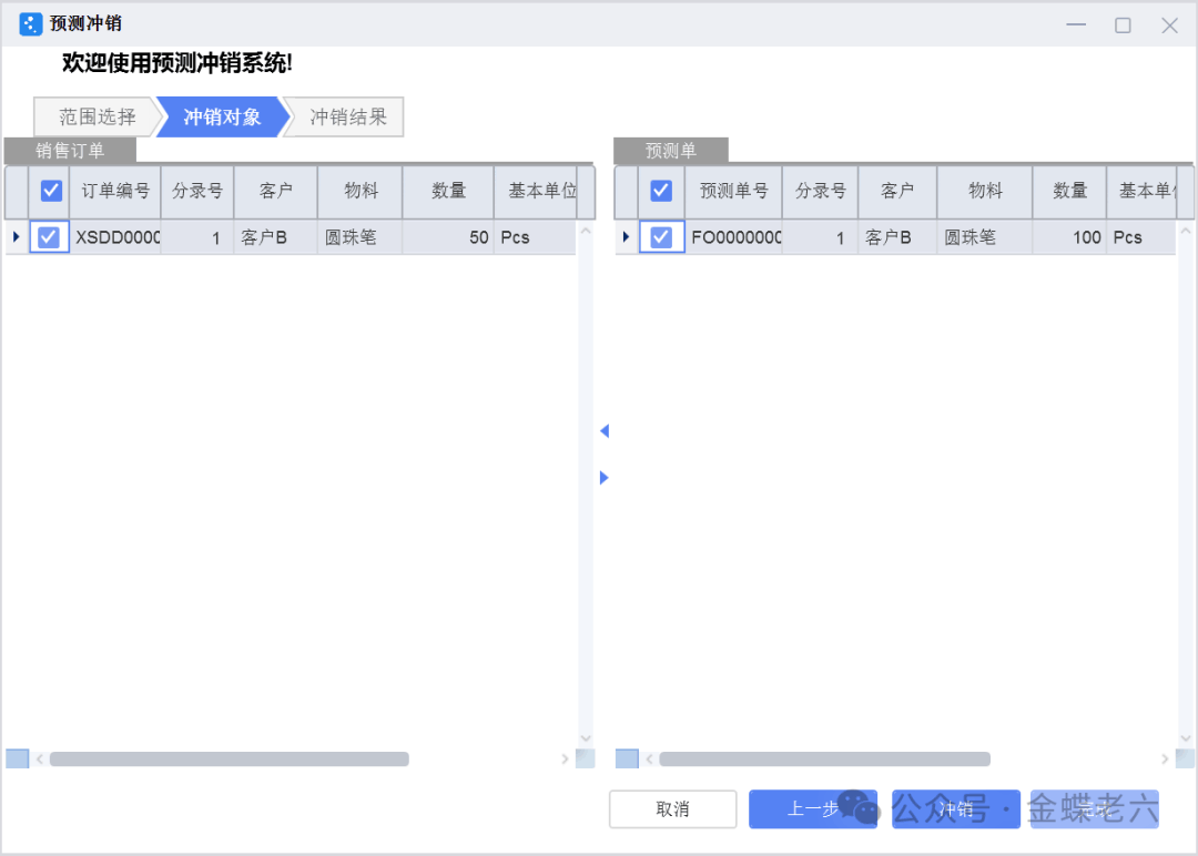 2. 执行冲销:可通过“多组织预测冲销”功能,手工选择或由系统自动匹配销售订单与普通预测单进行冲销。
