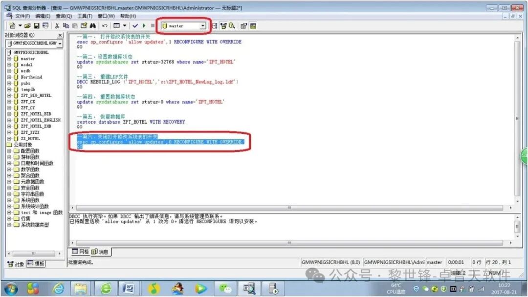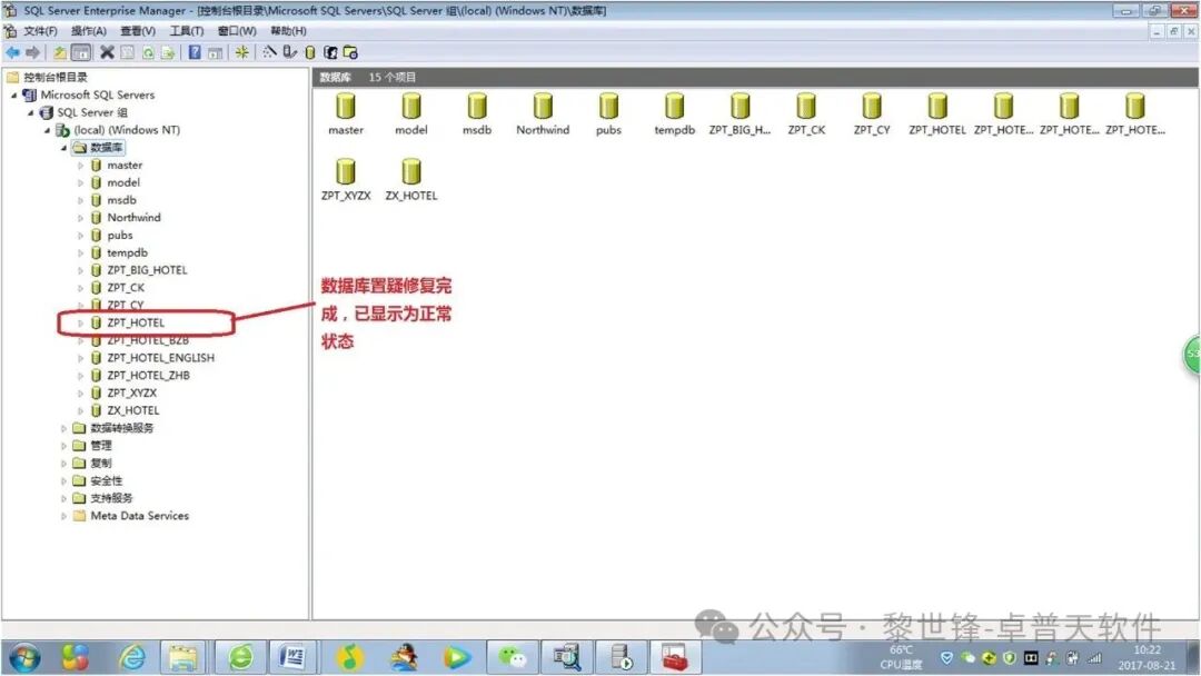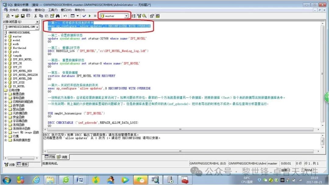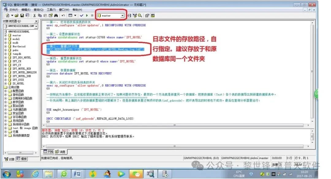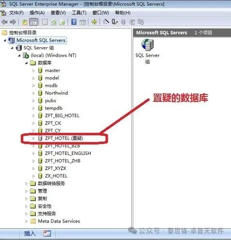 (注意:下面的SQL语名中的“ZPT_HOTEL”,表示是我要修复的数据库的名称,实际应用中,要替换为实际置疑的数据库名)。