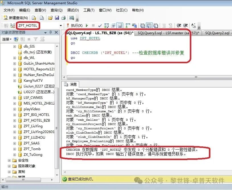 数据库的检测和修复SQL和上次相同(修设数据库名是:ZPT_HOTEL)。