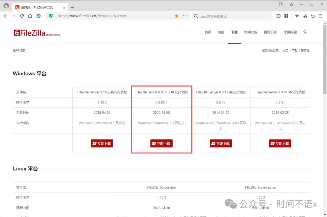 3. 选择Windows平台版本,点击“Filezilla中文安装板”进行下载即可(也可选择中文版)。