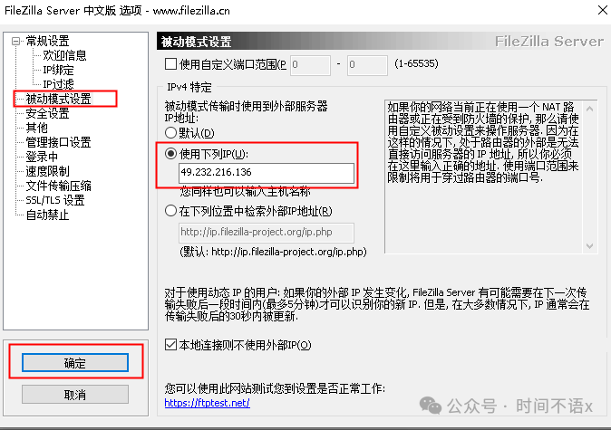 2. 如发现提示如下错误,可手动修改服务器IP地址解决,依次点击“编辑”,打开设置界面,选择被动模式设置,勾选“使用下列IP”,并填写服务器的IP地址,之后点击“OK”保存。