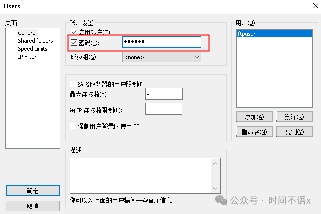 - 用户名:搭建 FTP 服务 时设置的 FTP 用户的帐号。图中以 “ftpuser1” 为例。
