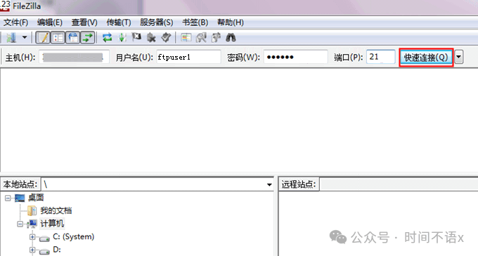 2. 在 FileZilla 窗口中,填写主机、用户名、密码和端口等信息,单击【快速连接】。