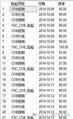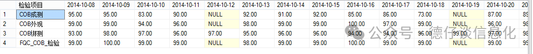 --抓取数据写入临时表#tempcobselect a.检验项目 , CONVERT(char(10),a.日期,120)日期,Convert(decimal(18,2),cast((SUM(a.测试数量)-SUM(a.不良数量)) as decimal(18,2))/sum(测试数量))*100 as 良率 into #tempcobfrom (select 日期,检验项目, 测试数量, 不良数量 from 制程COB成测 union all select 日期,检验项目, 测试数量, 不良数量 from 制程COB外观 union all select 日期,检验项目,测试数量, 不良数量 from 制程COB绑测 union all select 送检日期,'FQC_COB_检验',检验数量,不合格数量 from 制程FQC_COB_检验 ) as a where CONVERT(char(10),日期,120)>='2014-10-01' and CONVERT(char(10),日期,120)<= '2014-10-30' group by a.检验项目,a.日期 --查看临时表数据,取分布日期(不重复)--select 日期 from #tempcob--select distinct 日期 from #tempcobDECLARE @SQL NVARCHAR(4000)=N'';--这里使用了xml处理来处理类组字符串SET @SQL=STUFF((SELECT N','+QUOTENAME(b.日期) FROM (select distinct 日期 from #tempcob) as b FOR XML PATH('')),1,1,N''); --加入了xml处理和SQL注入预防判断IF dbo.fn_CheckSQLInjection(@SQL)=0 SET @SQL='select * from #tempcob pivot (max(良率) for 日期 in ('+@SQL+')) as tt'EXEC(@SQL);drop table #tempcob