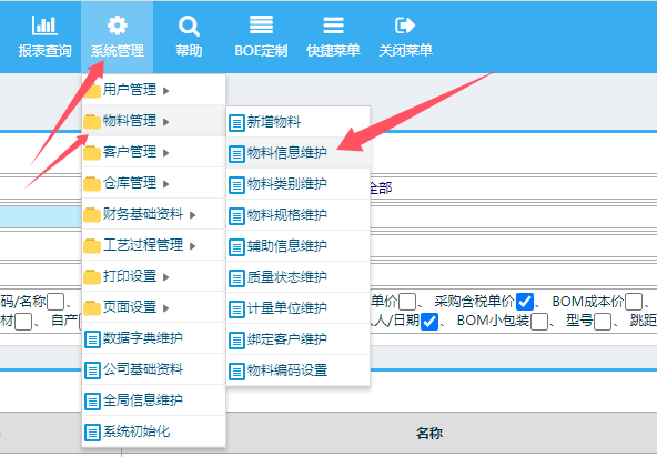 以管理员或有权限身份进入ERP系统-》系统管理-》物料管理-》物料信息维护: