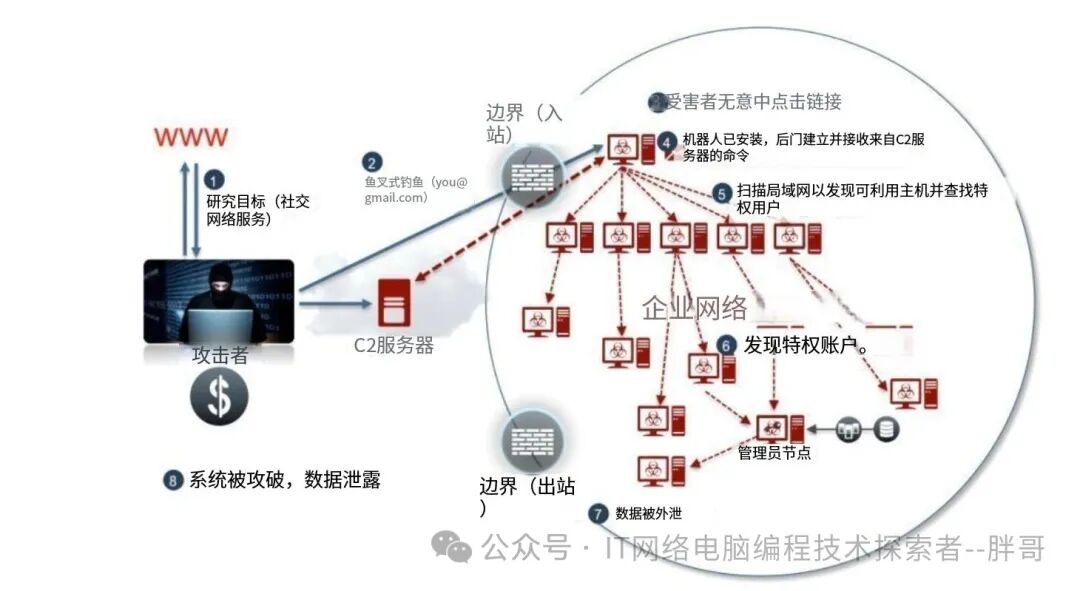 第3阶段:横向移动,一旦拿到权限,攻击者会在内网继续扩散:扫描内网服务器->连接共享目录->登录其他电脑->最终控制更多设备。