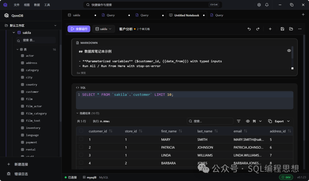 - • 数据库笔记本:QoreDB 支持 Notebook,可以把数据库查询、结果、变量和 Markdown 文档组织在同一个可执行笔记本中。