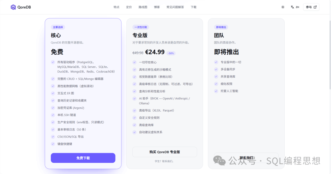 QoreDB 除了提供免费使用的核心版本之外,还提供了更多高级功能的专业版,两者特性差异如下: