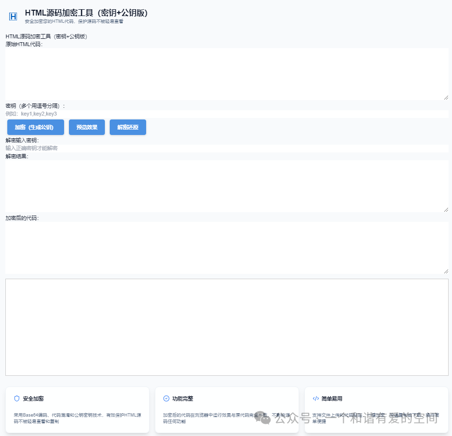 支持文件上传和代码粘贴,一键加密,快速复制或下载,操作简单便捷