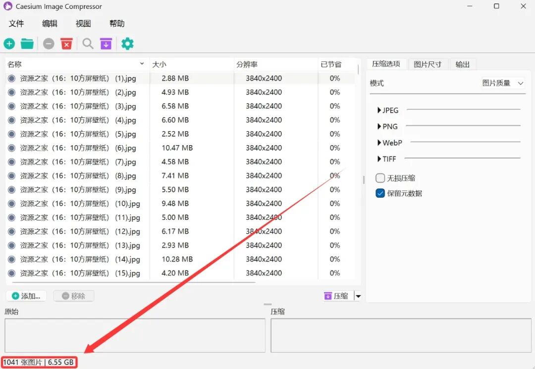 在软件的界面中,首先导入你需要压缩的所有图片,我这里导入1000张高分辨率图片,总大小达到了6.55GB。