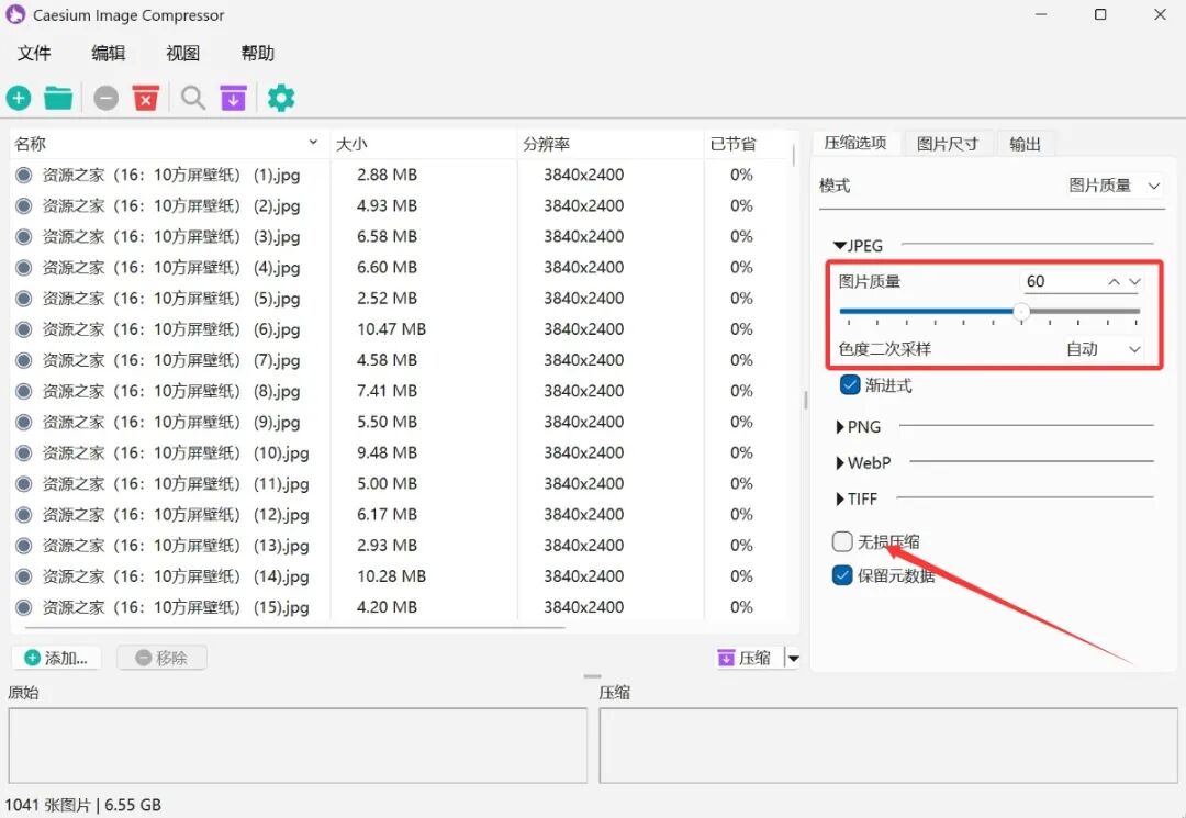 然后在压缩选项中根据自己的需求来选择图片的质量,数字越小,压缩出来的图片大小就越小,如果你不想要图片的画质有损伤,也可以勾选无损压缩。