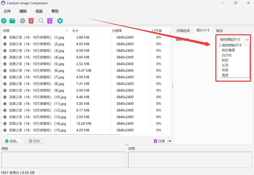 接着在图片尺寸选项中来自定义压缩后的图片长宽,你可以保持图片原始尺寸,也可以根据像素或者百分比来调整图片尺寸。