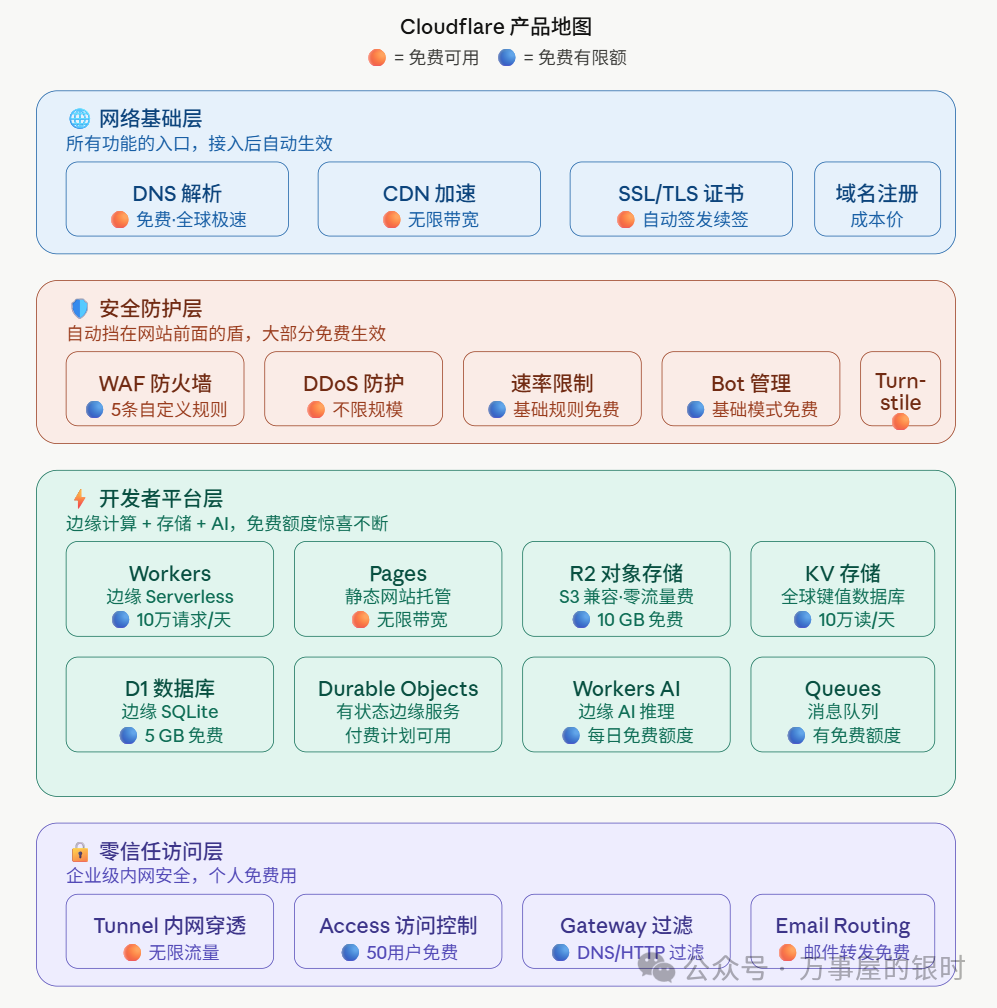 Cloudflare产品地图├──🌐网络基础层│├── DNS 解析│├── CDN(内容分发)│└── SSL/TLS 证书│├──🛡️安全防护层│├── WAF(Web应用防火墙)│├──DDoS防护│├──Bot管理(机器人拦截)│├──RateLimiting(速率限制)│└──Turnstile(人机验证)│├──⚡开发者平台层│├──Workers(边缘计算/Serverless)│├──Pages(静态网站托管)│├── R2(对象存储)│├── KV(键值存储)│├── D1(SQLite数据库)│├──DurableObjects(有状态边缘服务)│└──Workers AI(边缘 AI 推理)│└──🔒零信任访问层├──Access(应用访问控制)├──Tunnel(内网穿透)├──Gateway(DNS/HTTP 过滤)└──EmailRouting(邮件转发)